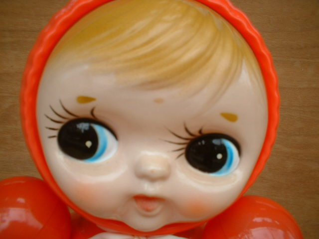ビニール袋から出しました。少々経年の色褪せ頭の上若干目立たない小さな色ムラ有りますが当時品としてはとてもきれいです。