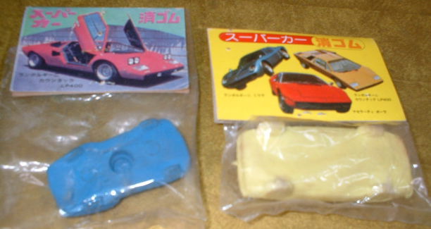 の消しゴム、そしてこのスーパーカーの消しゴム、カウンダックなどの外車、日本車の沢山の種類の車の消しゴムが駄菓子
